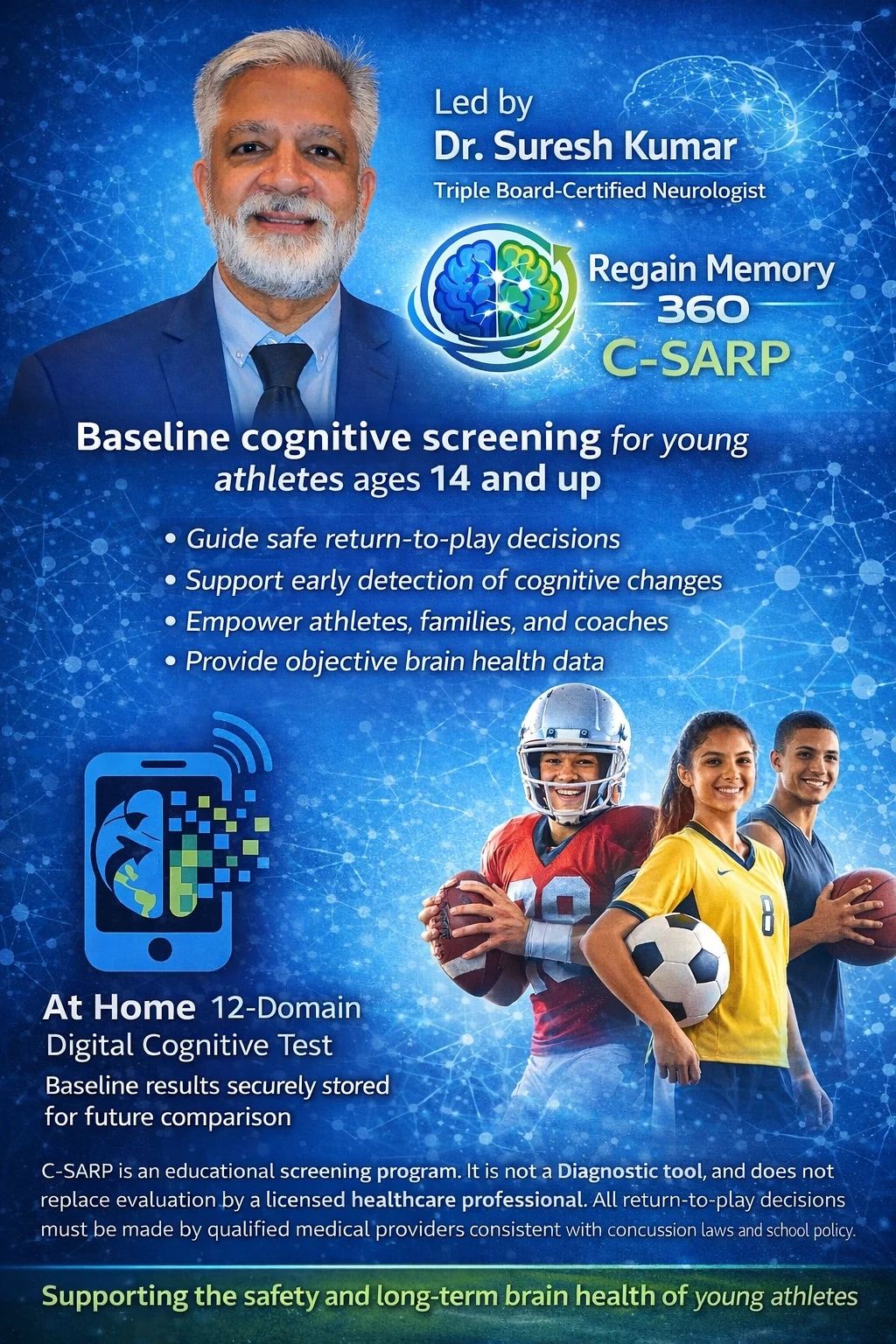 C-SARP is a home-based cognitive screening program for athletes that establishes a baseline brain health profile using a 12-domain test for age 14 and up. It helps guide return-to-play decisions and supports early identification of cognitive impairment.